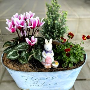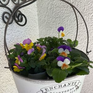 ブリキ鉢にうさぎさんと😊毎年これにシクラメン2個だけど98円のめっちゃ可愛いビオラがあったので今年はこれで。シクラメンのお隣なので大きくならないでおくれ😅