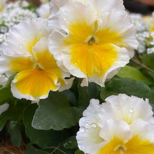 ビオラ エッグタルト🌸 その名の通りエッグタルトのような美味しそうなビオラ💛 鮮やかな黄色と真っ白なピコティ オサレなフリルもたまりません🤭 いつものように 3株+スイートアリッサム 寄せてあります🪴 🌸No.35、36、37🌸