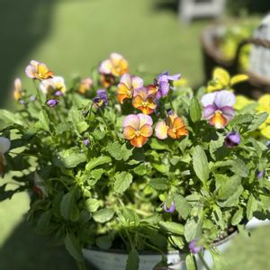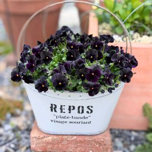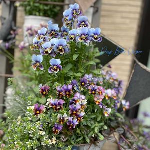 宮崎ビオラと庭人さんビオラの入った 友膳のブリキ鉢は満開状態🌟💐˒˒✧