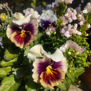 冬の寄せ植えのビオラが綺麗に咲いてきました。ビオラはシエルブリエ(白と薄紫の2株)です💡 一緒に植えたのは エレモフィラバニラ ハゴロモジャスミン です。
