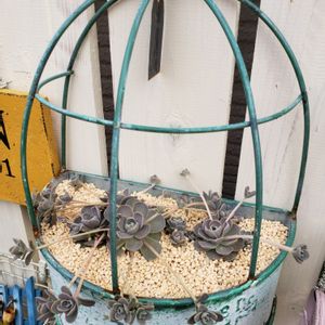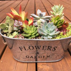新しい子たち⑤✨ 前からも後ろからも楽しめるブリキの鉢に、いろいろと寄せ植え😆 今まで買い溜めた多肉も一緒に詰め込みました😃 真ん中の画像が真上から、上下の画像が前後のものです😉 なんとなくバランス良くできたかな? 問題は維持の方…💦 元気に育てー🙏