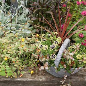 モニター当選の黒真珠植えました! アクセントにコルジリネとハツユキカズラを仲間にしました。しばらくはピンチしながら株を大きくして、バスケット型の鉢に溢れんばかりの花を咲かせたいですね!