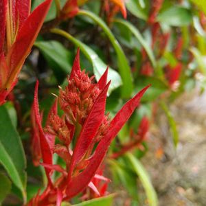 晴れ間が出てきて 雨上がりのレットロビンの花芽が 輝いていました❣️✨ 後ろにも新芽がわさわさ🌿