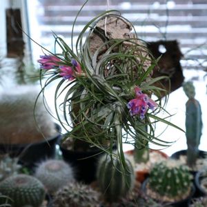 2度目のストリクタ 数年前、初めて買ったエアプランツはストリクタでした。 淡い色味のお花がとても綺麗で一目惚れでした。 が、よくわからず蒸らして枯らしました😇 最近イオナンタとアンドレアナを買い、勉強しながらおっかなびっくり育てて約2ヶ月。イオナンタは子株を吹き、アンドレアナは発根しました。う、嬉しすぎる・・ 調子に乗ってフンキアナやフックシーもお迎えしました。 細いやつらも想像していたより大丈夫でした。 今なら行ける気がする・・ そんな気持ちが抑えきれず、かつてストリクタを買ったお店に駆け込んだ月曜の夜。あの淡い色のがいいの・・あった!花芽!クランプ!花序が伸びないまま花咲いてる!なんか変?わかんないけど可愛いから良し!! 密集状態で維持できる自信はないのでクランプ解体。 一つはフリーセアの上に安置。 そんな期待と不安と興奮が入り混じる初夏。 チラ棚が形成されつつあります。沼🫠 夏に全滅しないことを祈ります。