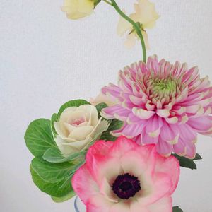 おはようございます 玄関のお花達です ガーベラ、八重トルコキキヨウ 八重アネモネ
