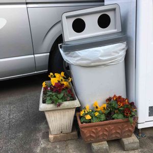 明けましておめでとう🎍ございます。 今年もよろしくお願いします。 新年初の写真がゴミ箱😅😅😅😅 ゴミ箱がヨダレかけ、しているように見えて〜妄想癖 足元には、パンジー。
