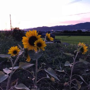 6月にタネを蒔いたヒマワリが全て咲きました! タネを蒔いた後に大雨が降ったため、タネが流されたようで少ししか目が出ませんでした…。 写真は夕日に映えるヒマワリ🌻