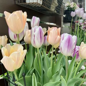 ①②チューリップ アプリコットビューティーと フレミングフラッグ 咲き出しました🌷 開花時期と背丈もバッチリ合いました!ヤッター✨ ただ今年のチューリップたちは、花茎がぐにゃりと 曲がってしまい放っておくとそのまま折れてしまうものが 多いです こんな事ははじめて🤔 曲がり出したものには支柱を立てています ③ラナンキュラス チョコレート 満開になり更に花色鮮やかです ④こぼれ種のビオラ ラブラドリカ エアコン室外機の横で毎年この時期に満開になります