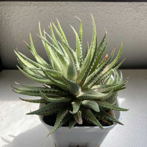ハオルチア 十二の巻錦の白蝶 冬の室内管理で、中心部が白く光っているように見えます🎵😃✨ 子株も大きくなってきました❗ (*^▽^*)🎶