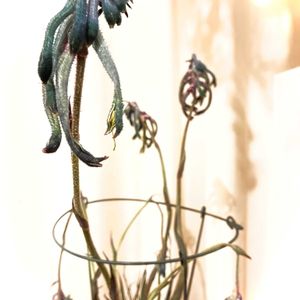 ポー‼︎‼︎‼︎‼︎ ぐったりとしたカンガルーポー🫠 (を無理やり自立させています) 半日陰の屋外に置いてみると数日で 花や葉は自立しなくなり 部屋に取り込んでもしおれ続ける一方… プラ鉢から通気性の高い鉢に替えて 土も根っこもかなり手入れして人事は尽くしました。