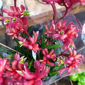 園芸店で目を引く「アニゴサントス カンガルーポー」 マスカレードとカーニバルの2色が並んでいた。 花の形がカンガルーの前足に似ているところからこの名が付いたようです。