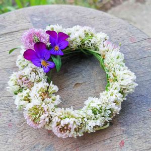 小さな生花リース作りました 実家で畑仕事をお手伝い👒 その辺の草むらでオヤツタイム中に作りました シロツメクサ ビオラ? ムラサキツメクサ←正式な名前初めて知りました😆 花遊び楽しいですね🌿