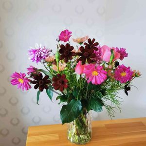 コスモスたっぷりアレンジ コスモス ダリア バラ シュウメイギク チョコレートコスモスチョカモカ ヒオウギ 秋の花も楽しまないと🎵