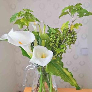 実家の草花をアレンジしてみました🌿 カラー フサスグリ 白と緑で爽やかに♡💚 ガラスのウォータージャグで涼しさを💙 そういえば、私GS3年生に進級していました🤣 いつもたくさんのいいね!コメントありがとうございます(✻´ν`✻)