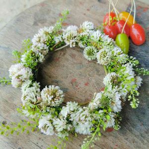シロツメクサとマメグンバイナズナのリース作りました 実家の庭に実ってるグミを添えて