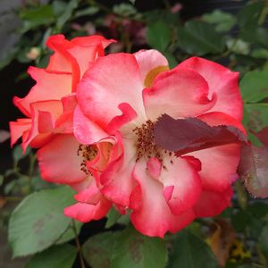 令和7年6月10日(火) 2025年ローズコレクション🌹🌹🌹🌹🌹 No.10 センチメンタル(木立性・四季咲き) 紅白の絞りが綺麗😍🎶クレマチスさんと寄り添って咲いていました😄🌹仲良し✨️ 今日は、☂️降りなのでお家で模様替えして過ごします💨 皆様、良い1日を☘️