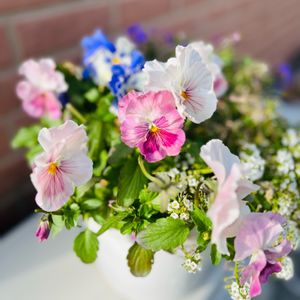 こんにちは😊 今日は朝起きたらうっすらと雪が積もってる寒い朝❄️❄️ 中々お日様が顔を出さない中 少しの晴れ間にお気に入りの白い鉢のお花を日向ぼっこ アリッサムに圧倒されていたパンジーさん やっと本領発揮 可愛いく咲いてくれました °*.\(*´∀`*)/.*゜⸜(*ˊᗜˋ*)⸝