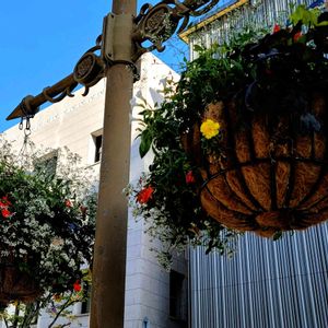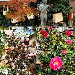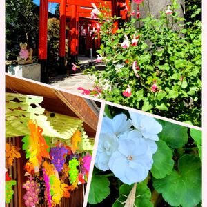 鳥居⛩️と🌼チェリーセージ🌼の赤が相俟っていい感じ😊 🤍ゼラニウムにバッタさんが…😉 太陽の光と風で飾り付けがキラキラ✴️してました