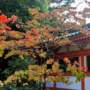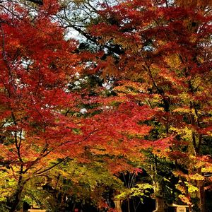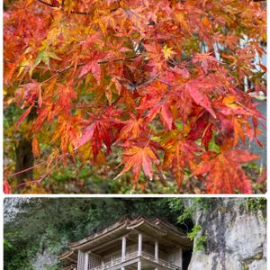 おはようございます☀️ 昨日は雨が降ったりであいにくのお天気でしたが紅葉狩り🍁🍁に行って来ました。 紅葉真っ盛り 三徳山三仏寺投入堂 標高900メートルの三徳山に境内を持つ山岳寺院 その奥院の投入堂は垂直に切り立った絶壁の窪みに建てられた日本一危険な国宝と言われてます。 流石にそこまでは登れませんてましたが下から望遠鏡で覗けます😅