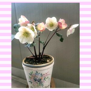 待ちに待った🤍クリスマスローズ みんな揃って咲きました🎵 ①鉢カバー付けてパチリ📱 ②嬉しすぎてアップでパチリ📱 ③早く咲かないかなぁ~って2/23に蕾🤍をパチリ📱