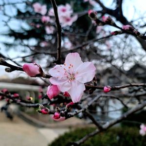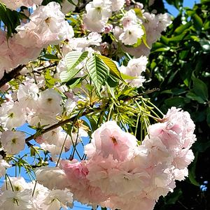 いつもお参りする⛩️で… ①八重の桜🌸が青空🟦にとても美しいです✨ ②ハナモモも綺麗に咲いてます😆 ③青もみじにお花が…🎶 しだれてるのでいい感じ😊 今日は☀️で少し暑かったけど気持ち良く歩けました🚶♀️