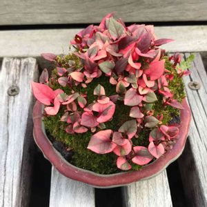 昭和記念公園、盆栽苑でみた 班入りいたどり 葉の色が緑とピンクで綺麗