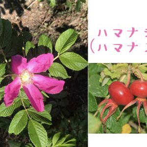 ハマナシ(ハマナス)バラ科 ハマナスの名で知られるが、これは東北地方でなまってできた呼び名といわれる。ナシに似た果実であることから。(牧野冨太郎の説が通説になっている) 漢字で浜茄子と書くが茄子に似ていない。酸っぱい味が梨に似ていると言う) 見た目はミニトマトだ。浜ミニトマト⁈ 知床旅情が 「知床の岬に はまなしが咲く頃」だと 間が抜けてしっくりこないからやっぱりハマナスがいい