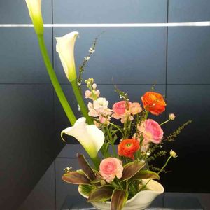 受付のお花です。 高めに入れるつもりでしたが、水盤が小さくバランスが悪かったので、ソケイを選び直し、手前に流すように低めに入れました。 地味好きの私としては、バッリバリの生け花にしたい花材でしたが、、、そこは受付なので。締めはカラーリーフ(赤ドラ)とソリダスターで、華やかさアップしてみました。