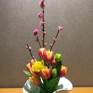 植生的な感じで生けた作品です 赤芽柳 チューリップ 水仙 フリージア こでまり