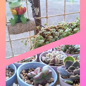 おはようございます☀ 久しぶりにコーヒー☕️飲みながら優雅な 朝パトロール✨✨ お気に入りの空間でコンテスト参加させて頂きます🎶 セダムちゃんモリモリ元気に育って来ました🥰 手前のカゴ寄せ植えはお気に入りの一鉢💕 お一人様にした謎エケやっぱり大き過ぎません⁇ また花芽出てきてすこぶる元気なようですが。。。 ピーチ🍑ちゃんはここのところグッと伸びて来ていい感じ🎶🎶🎶