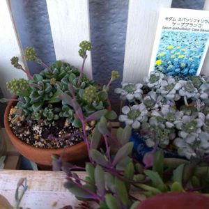 DAISOの多肉(写真下) オリビア、ブルーエルフと"名無しさん" 最近は(チョット小さめですが)隣のスノーバニーの姿に似て来ました この名無しさんは紅葉🍁すると うっすらピンクになるんです