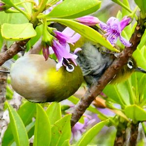 満開のハマジンチョウには、たくさんのメジロが来ていました🎵