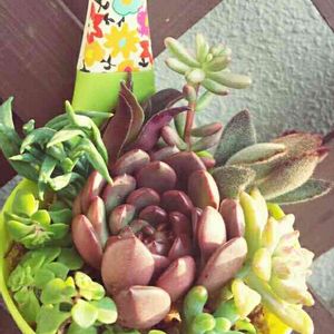 100均にあったお玉に多肉寄せ~😊🎶 ちょうど穴も空いてたし、花柄🌼でいい感じ~⤴⤴ 今日はいい天気〰😆☀