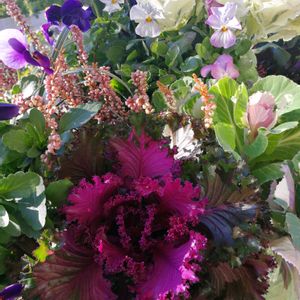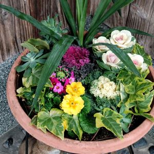 寒さで色味が深みを増してきたハボタンたち🎶 それぞれの寄せ植えの鉢々の中で、様々な花が咲いたようです🥰