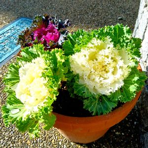 白薔薇の雰囲気が気に入っている 葉牡丹フレアホワイト♡ 昨年11月の終わりには、緑の斑💚が入り、キャベツに近付いていたけれど😅 その後、気温が下がり冬らしい寒さになってきたので、白さが復活して美しさが戻って来ました🥰♡♡♡ 4⃣5⃣今日も朝から暖かな日差し☀がいっぱい届いています✨♬