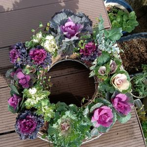 リース初挑戦😅🤣 GS友さんのアドバイスのもと、頑張ってみました。普通の寄せ植えも苦手な私にとって難しかったです。根をたくさん崩すのが怖くて、アリッサムを入れるのを諦めました。片目で見てね😋😅
