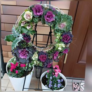 1週間ほど前に作ったリース、玄関前にデビューしました。イーゼルが今朝届いたら待ってられなくて…下の鉢は重石代わりです。冬は、ほぼ毎日強風なので😅