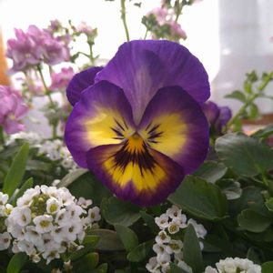 こんばんは☺️ よく咲くすみれブルーベリーパイとネメシアの寄せ植えです☘️💜☘️💜 今年は、寒さが厳しく、毎日凍っているので、家の中にいれました☺️ 家の中も寒いので、しばらくは、花数増えないと思います☘️🌼☘️🌼 可愛いお顔が、気に入っています😉💞💞