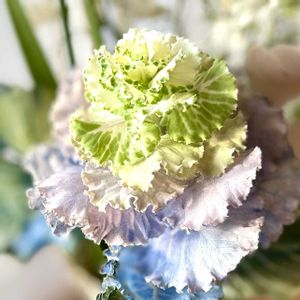 お正月飾りに購入した 青い葉牡丹🌸 色水を吸わせて染色した 葉牡丹なのだそうですが (2枚目のpicが購入時の葉牡丹) 真ん中の芯がモコモコ育ち なんとも涼しげなグラデーションになりました🌈✨ 面白いです♪