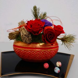 おはようございます。 今回のプリザーブドフラワーのレッスンは、爛々です。 お正月飾りです🎍 自前の🌹を追加して、豪華に仕上げました🎵