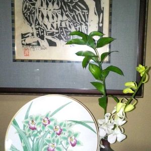 お正月三箇日ももう終わります ①白いお花デンファレ 緑の葉ルスクスヒポフィルム 絵皿シンビジウム ②小物飾り 後ろは砂絵孫作品 ③御節 一応作りました ④今年の干支🐍 可愛い ⑤そうそう忘れていました 年末に竜さん達と巳さん達の 引き継ぎ式が行われていたわ 瑞雲に乗った長老の竜さんが 色々教えてあげていたようね