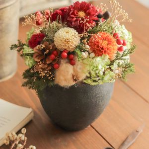 あけましておめでとうございます。 今年も皆さんにとって、幸多き年となりますように…😌🙏✨ 画像は、大晦日に制作したドライフラワーアレンジメントです。(生花じゃないですよ) 色々なダリアを使いました☺️✨ ダリアは和風な雰囲気を醸し出してくれるし、コロンとかわいいので、好きなお花のひとつです。