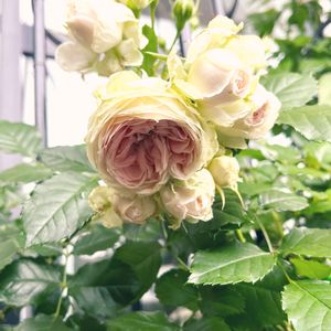アルベリックバルビエと、白いスイートピー。 ガレージ上の中央のオベリスク。 アルベリックは去年従姉妹から頂いて、この春初めての開花。 クリーム色から咲き進むと白になり可愛いな💕