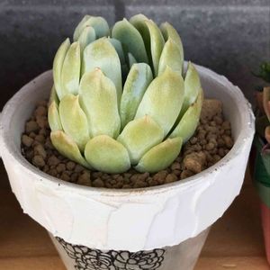 こんばんは🌙.*·̩͙.。★*゚ もう1つ…🍀 エレガンスという薄黄緑がとっても綺麗な多肉ちゃん😊💕 これも鉢にグイッと👍 お水あげたらバッカ〜ンと広がっちゃうのかなぁ?