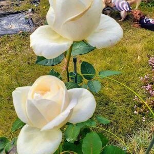 ホワイトクリスマス大きく開花💖 香りも素敵💕🌹🌿 愛犬りぃとさくらも登場💖