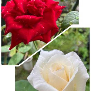 薔薇🌹赤と白 赤 イングリットバークマン 白 ホワイトクリスマス 今朝方は凄い雨の音で目が覚めました。咲きかけの薔薇無事開いていました❣️ 白と赤❣️オリンピックでの選手の皆さんの活躍素晴らしいですね👏今日は前半のハイライトシーンが放映されてますね🤗