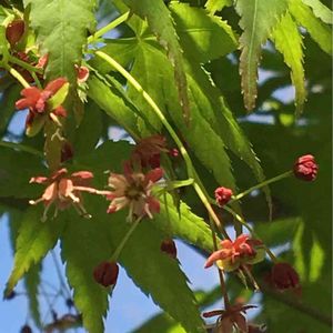 スッキリ 青空🎶 小さなつぶつぶが ぶら下がって 🙄❓ ジッと👀👀👀 あら〜〜 花 見つけた😍✌️ 知らなかった〜〜 モミジの花 とりあえず、手持ちの携帯で💕