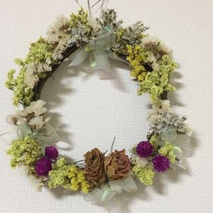 いろんな蔦で、リースって 出来るね〜〜😊 五葉アケビの蔓で、クルクルと そこに、ドライフラワーを 😅中々、くっつける作業中 ポロンポロン⤵️😱 均等に、中々できな〜〜い😢 ちょっと、リボン🎀も足して 何とか出来た😁🙌 夢中で、作る💕 これも、ストレス発散💕