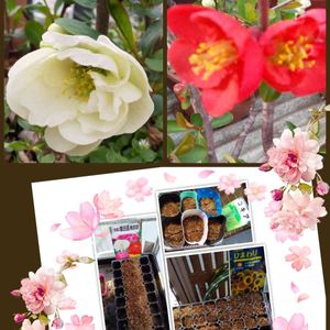 ❣️ボケの花💠 紅白 咲きました❗ また 今日は 春の種まき✌️ 🌿ヒャクニチソウ 🌿ヒマワリ 🌿コキア よく 育ちますように🙏❣️✌️❣️🙏