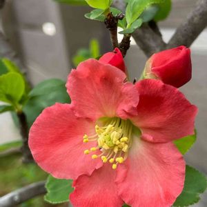 今、ボケ(木瓜)の花が咲き始めています。 上がサラサボケ(更紗木瓜)、下がヒボケ(緋木瓜)です😃 ボケには、赤花や白花、紅白が混ざった花など、いろいろな種類があります😃